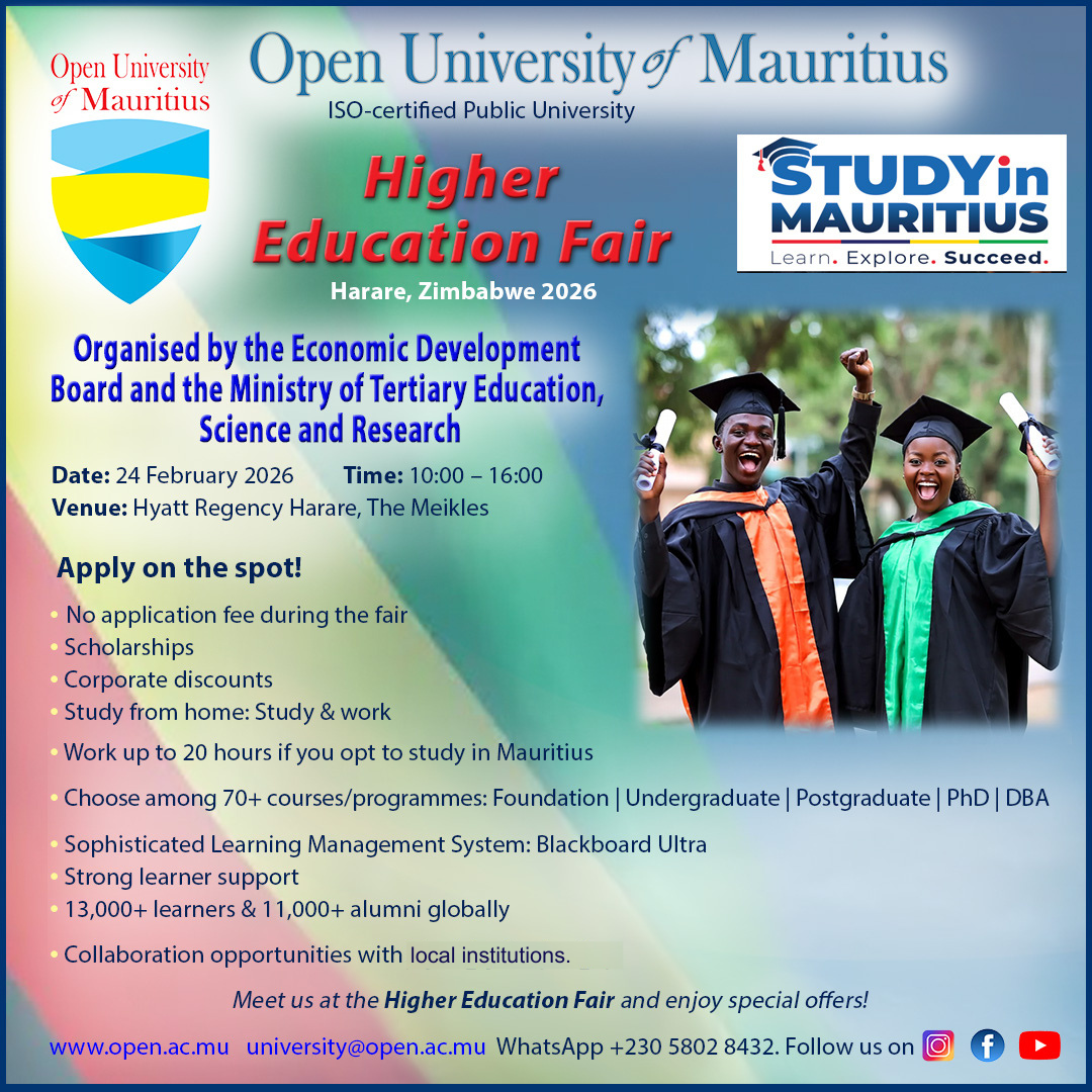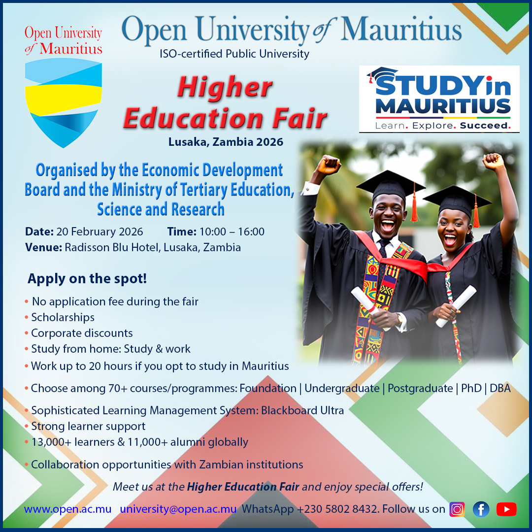 The Open University of Mauritius (OU) strengthening its regional engagement in Southern Africa through participation in two major Higher Education Fairs organised by the Economic Development Board and the Ministry of Tertiary Education, Science and Research of Mauritius.